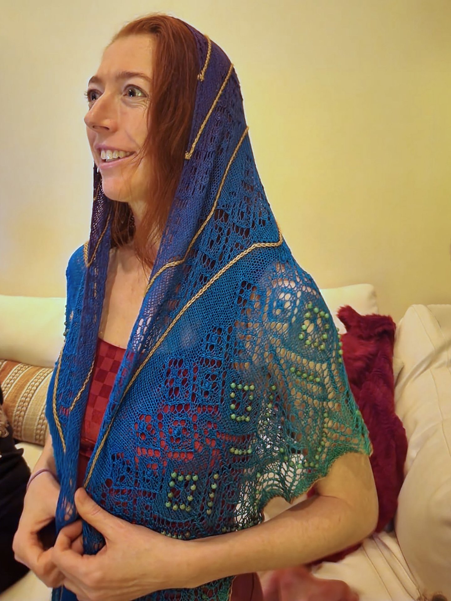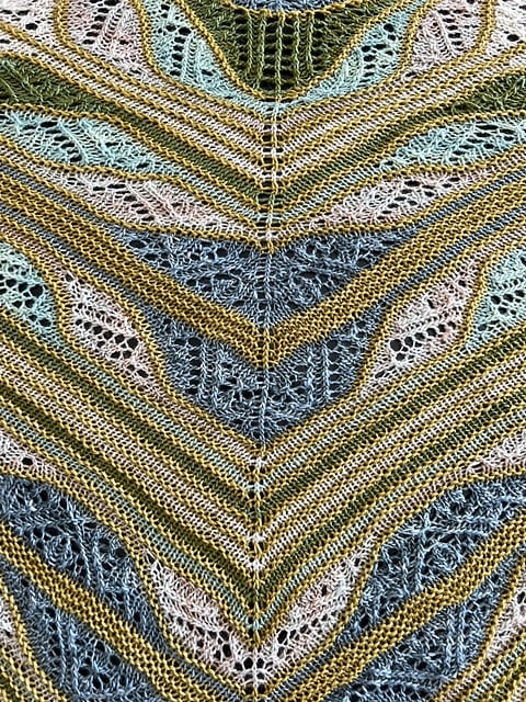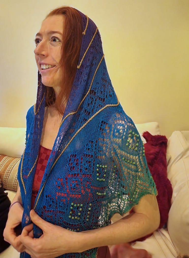 I could not resist creating another piece for Carolyn with the same theme. This one is Tina Arusoo's Tina Lilleaed. Adding the gold into the pattern was far more difficult than I had expected and I relished the challenge. The yarn is discontinued Vivid Fiber Arts, which was my first go-to source for hand-dyed plant-based fibers. Work with me if you'd like to try dyeing a long gradient--I can help with a dappled version.